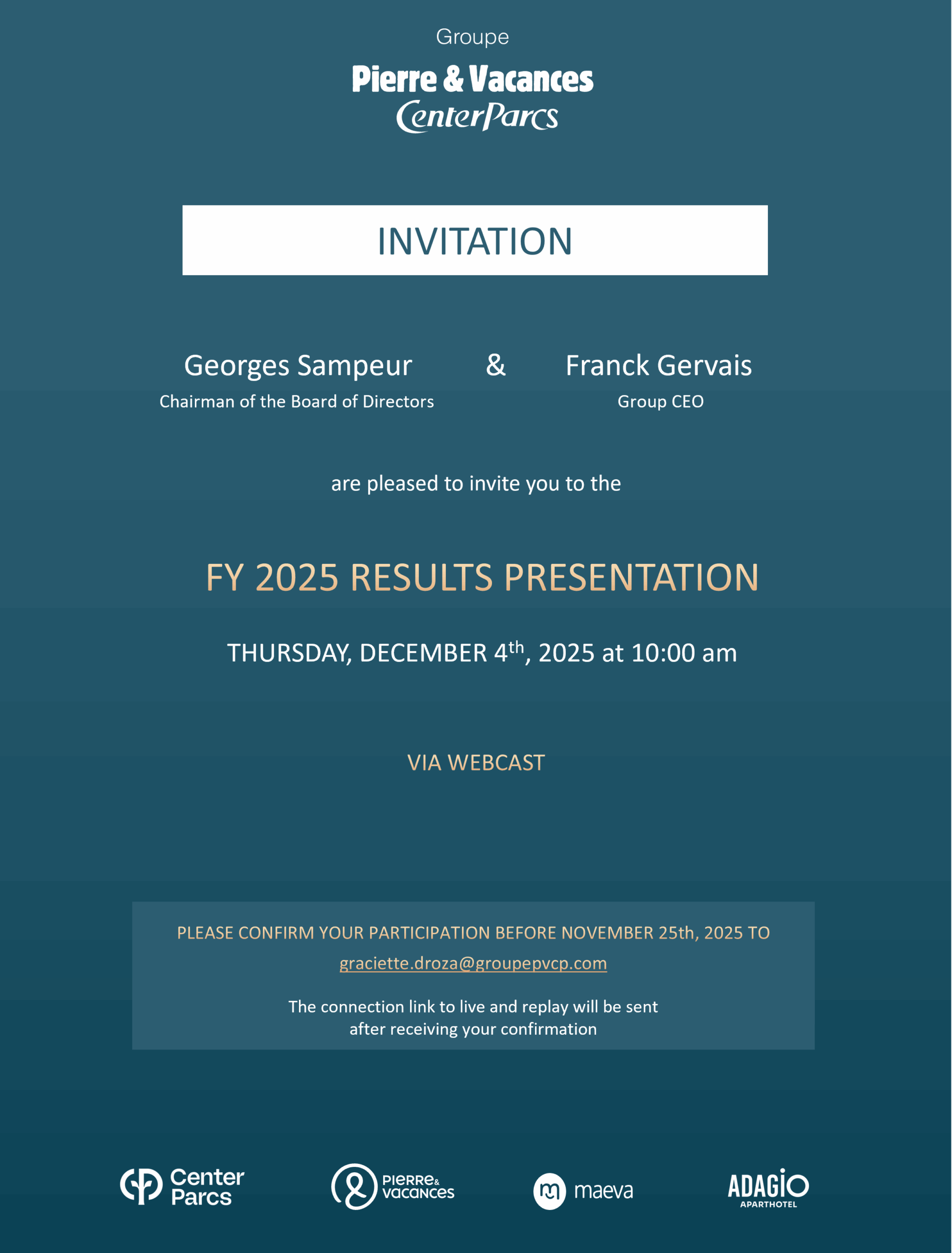 Pierre & Vacances-Center Parcs investor relations information: key figures, share price information, publications and financial calendar.